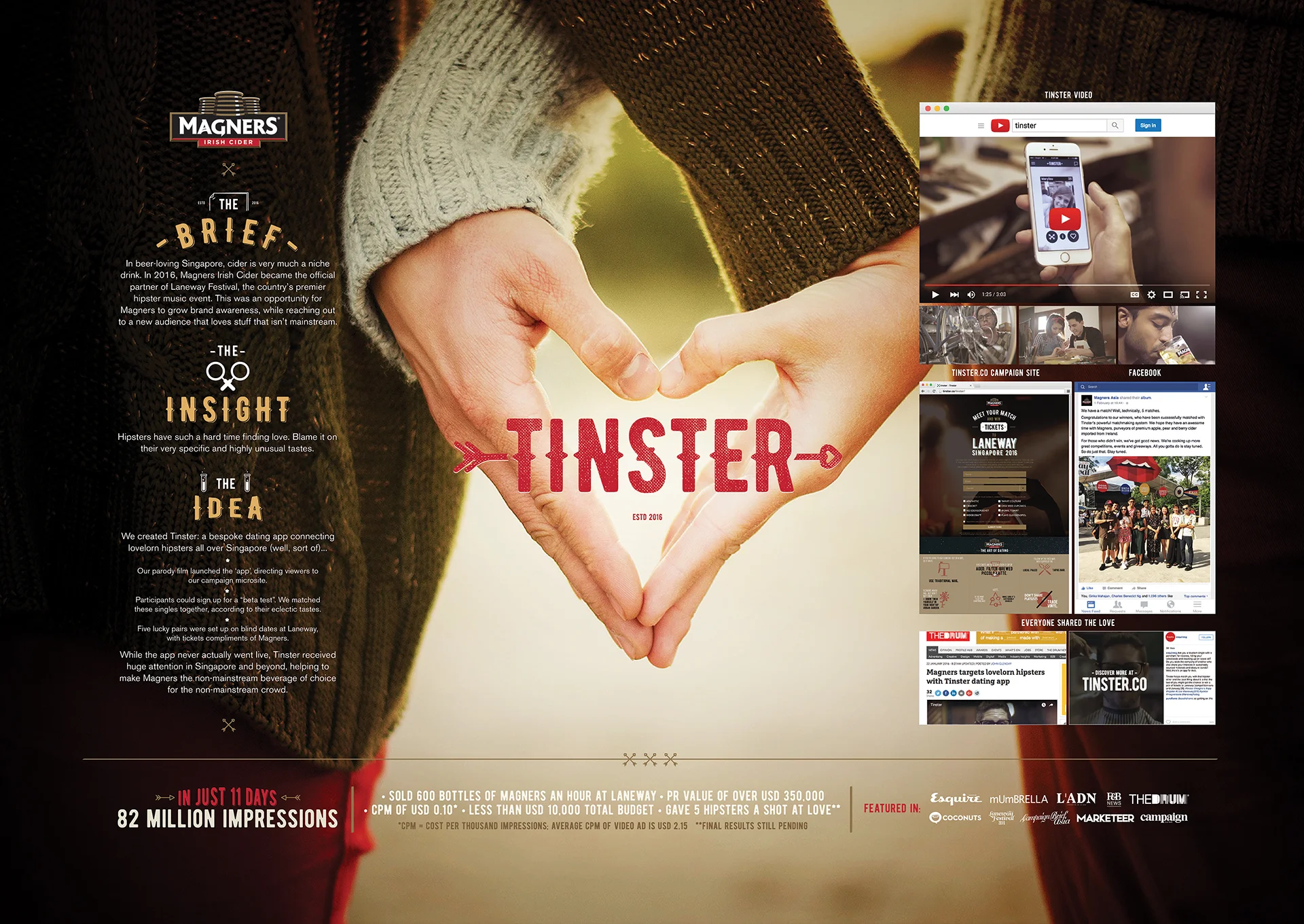 Magner’s Irish Cider had 5 pairs of tickets for Laneway Festival Singapore. With a small budget, we created Tinster an app to connect lovelorn hipsters.