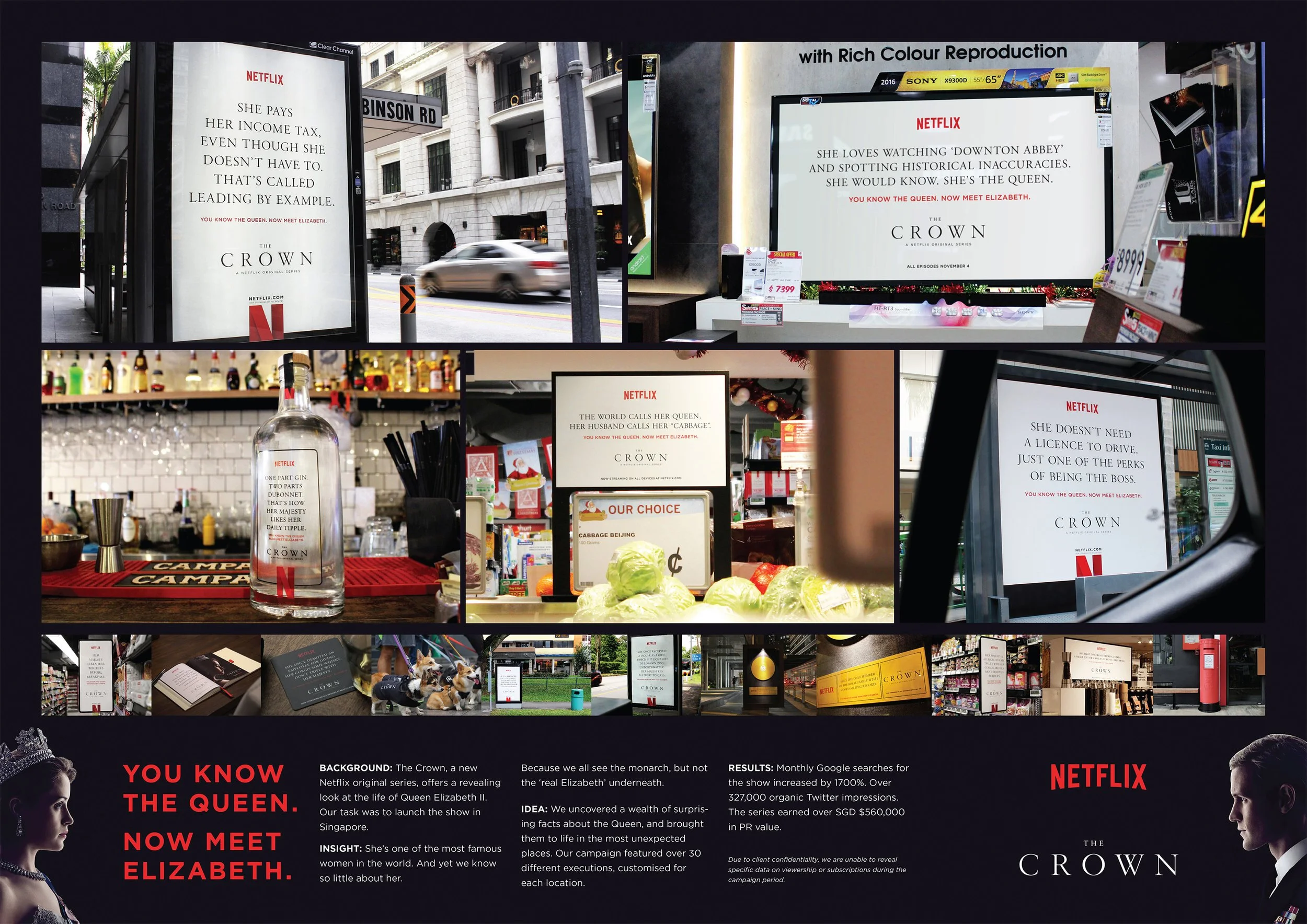 To promote Season 1 of The Crown on Netflix, we dig into the key insight that whilst the Queen is one of the most famous people in the world, the audience knows very little about her. Therefore, adopting an unconventional media approach, the campaign has been built around uncommon knowledge about the Queen at a variety of touch points spread across Singapore.